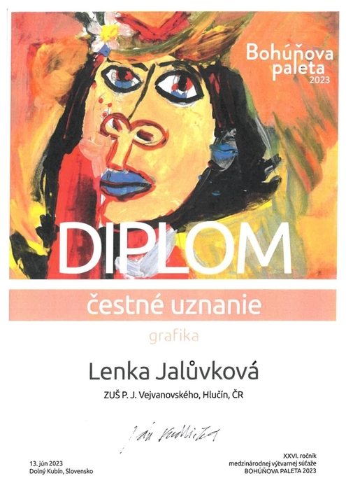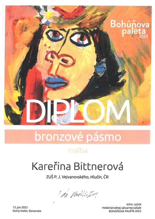 Gratulujeme Kateřině Bittnerové a Lence Jalůvkové ze třídy Liany Janíkové k úspěchu na XXVI. ročníku mezinárodní výtvarné soutěži Bohúňova paleta. Katka získala bronzové pásmo za svůj obraz "JÁ" a Lenka čestné uznání za "STRUKTURY".